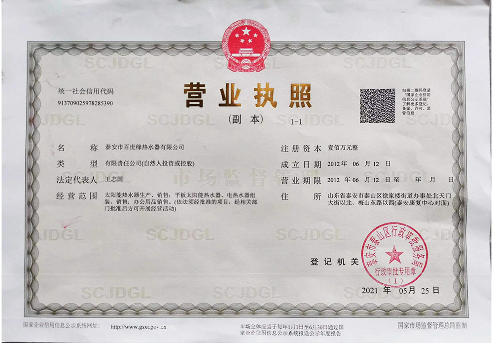 泰安市百世緣熱水器有限公司(前身是泰安市泰山區(qū)恒鈺太陽(yáng)能廠(chǎng)),緊靠京滬高鐵,京福高速,104國(guó)道,交通優(yōu)勢(shì)得天獨(dú)厚。公司依靠管理的精益求精,科技創(chuàng)新和準(zhǔn)確的戰(zhàn)略定位。